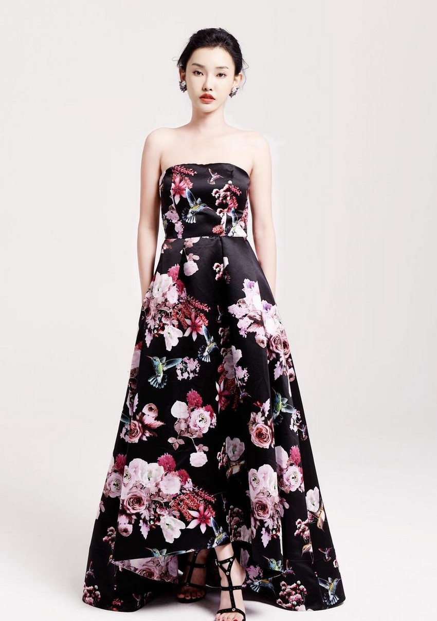 童菲,这位以其清新气质和灵动表演为人所知的演员,在此次拍摄中展现出了不同于荧幕形象的恬静与柔美。她身着的抹胸长裙,以淡雅底色铺陈,其上点缀着色彩柔和、形态各异的花朵图案,仿佛将整个花园的盎然生机穿在了身上。抹胸的设计恰到好处地展现了其优雅的肩颈线条与锁骨,既不失含蓄,又平添了几分轻盈的性感。